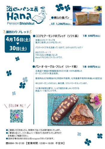 LATESTINFORMATION ペンションからのお知らせ 【Hana】4/18(月)~20(水)休業のお知らせ 2022年04月17日 【海辺のパン工房Hana】 4/18(月)~20(水)、パン工房Hanaをお休みいたします。 4/21(木)以降は12時より通常営業です。 416(土)~30(土)の週替わりパンは下記の通りです(クリックで拡大されます) ご予約、お取り置き、ご来店お待ちしております。 ペンションからのお知らせ一覧へ戻る